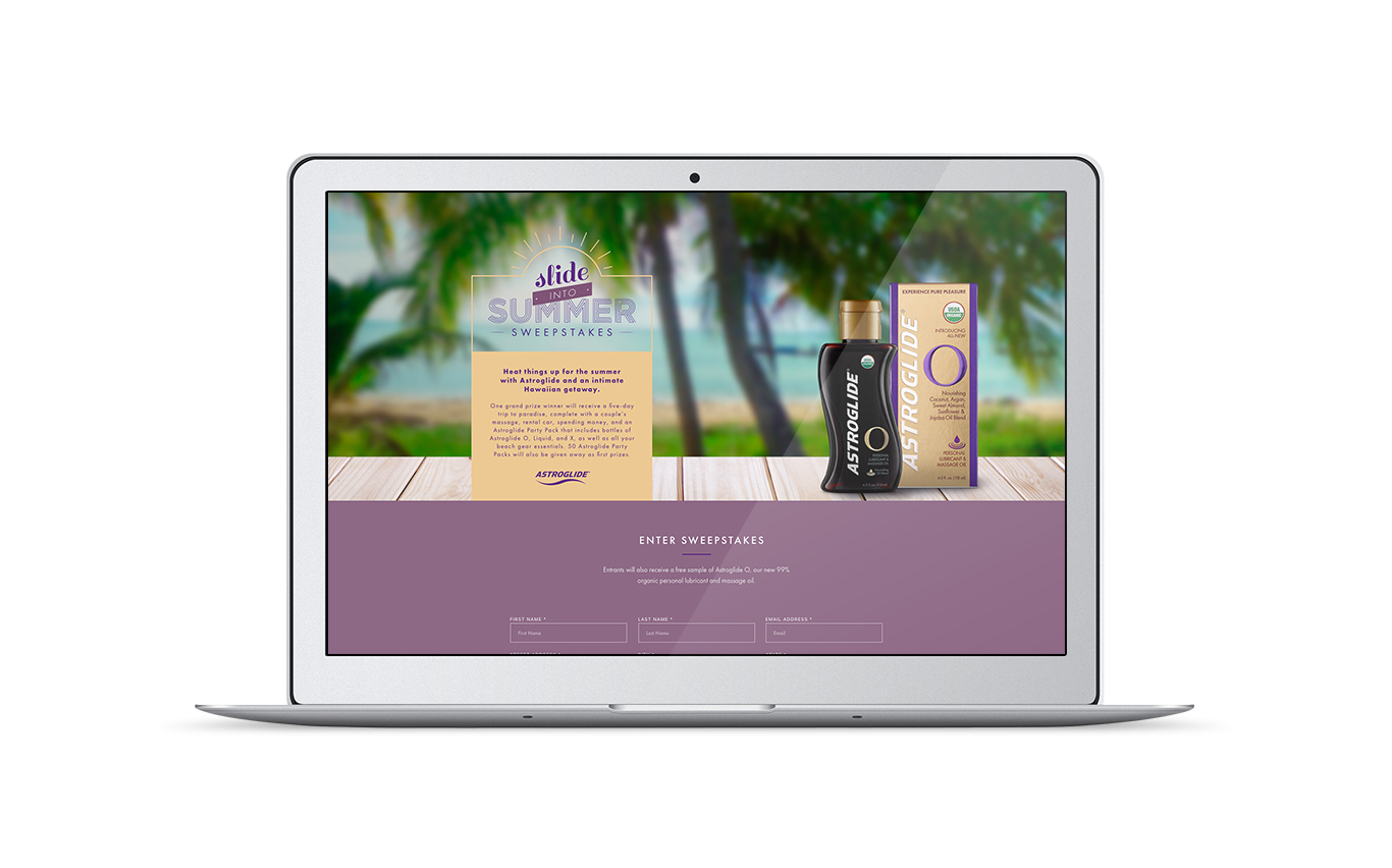 To generate more awareness of Astroglide O and promote trial requests, Astroglide hosted a sweepstakes that gave away product samples and a grand prize trip to Hawaii. We were tasked with the naming, the logo, and the design, content, and development of a landing page for the Slide into Summer Sweepstakes.
