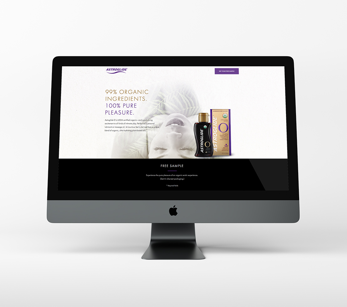 We wanted to emphasize the “au naturel” aspect of Astroglide O, and pair it with the experience of pure pleasure. Visually, we utilized a palm branch over shades of green and gray to speak to nature and relaxation, carrying these elements across banner ads, the homepage, a media page, in-store, and print.