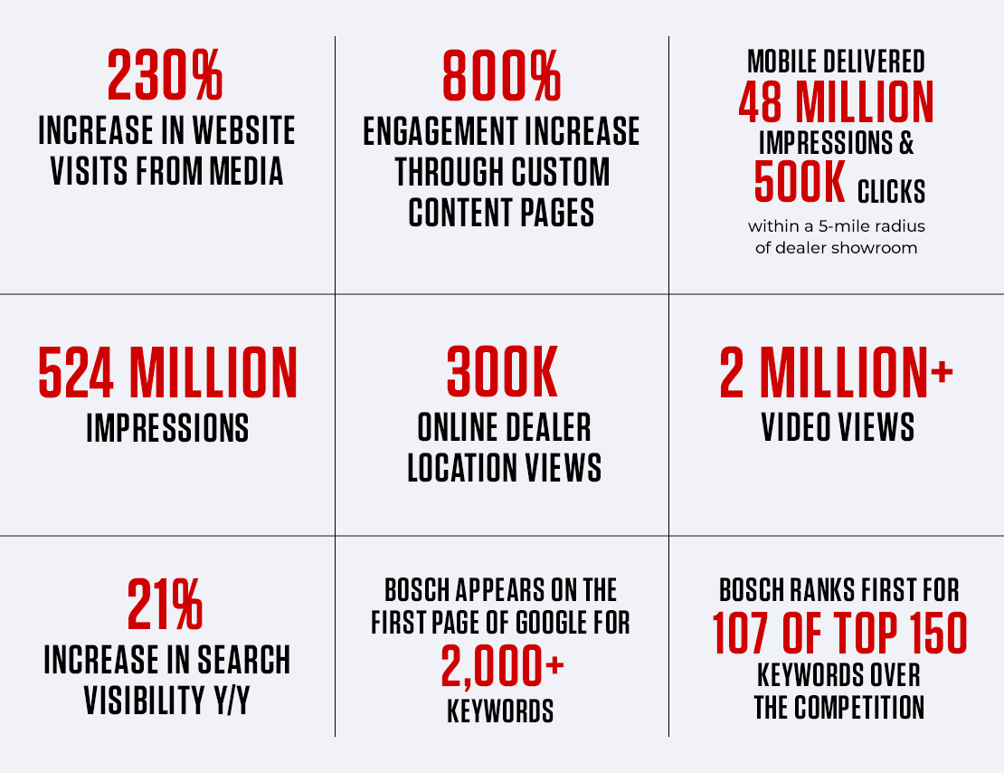 We tasked ourselves to improve consideration through custom content, increase dealer searches and conversion rates, and drive record awareness and visits to Bosch.com.