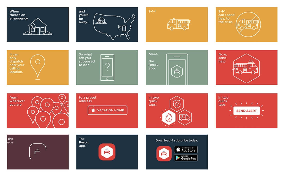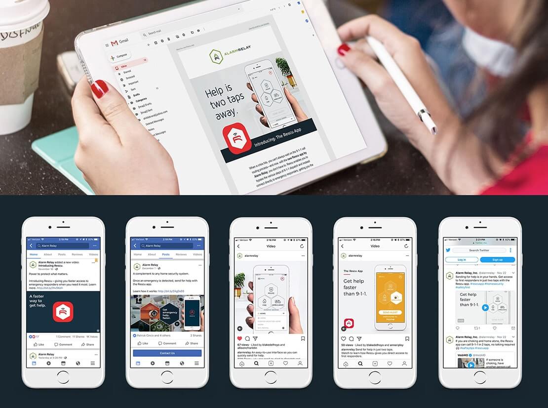 Beyond the animated videos, other marketing efforts supporting the launch of the Rescu app included: a landing page, banner ads, social ads, an email series, blog posts, printed sales postcards, a re-skin of the Alarm Relay homepage, app store product pages, and even the app onboarding design.