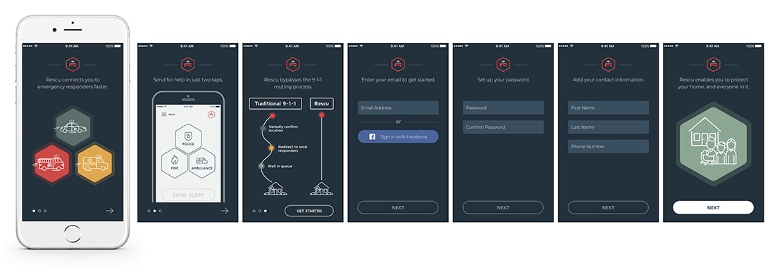 As an emergency response app, the logo design for Rescu needed to quickly engage the viewer while also conveying an immediate sense of safety and trustworthiness. We went with the more modern approach of clean lines and a minimalistic feel to establish security, and brought in a hexagon shape as a symbol for balance, unity, and communication. The red in the color palette helps associate Rescu as an emergency service, while the connectivity lines speak to the functionality of the app itself.