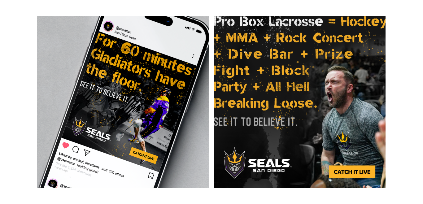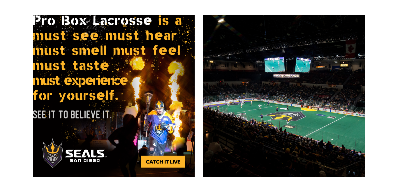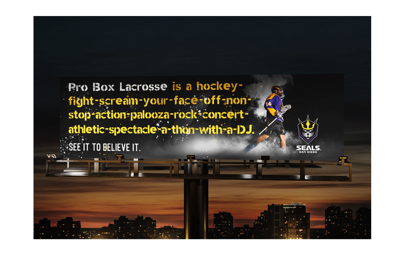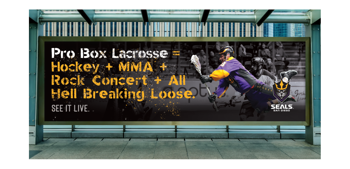 As the December season approached, the San Diego Seals faced a major challenge of distinguishing themselves and their sport from the city’s already-crowded entertainment scene. Red Door sprang into action and rapidly created a campaign and messaging strategy to emphasize the uniqueness of professional box lacrosse and make its identity and appeal more tangible and immediate to the audience.